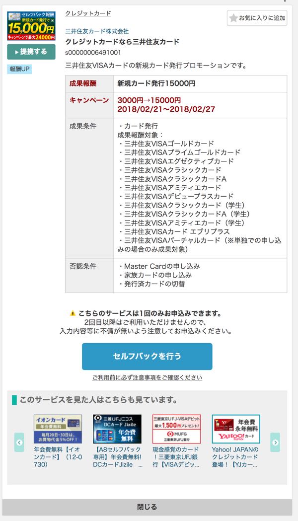 希望する案件の「セルフバックを行う」をクリックすると、案件の対象ページが表示されるので、「成果条件」に沿って申し込みを完了します。