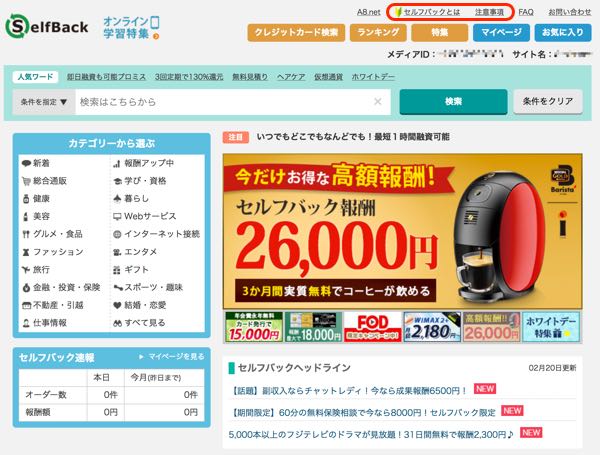 【2】 未提携の案件を探すなら、上部メニュー右の「セルフバック」をクリックします。